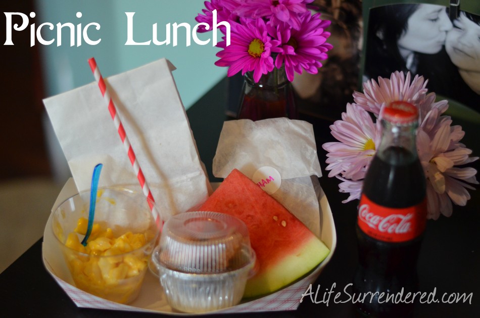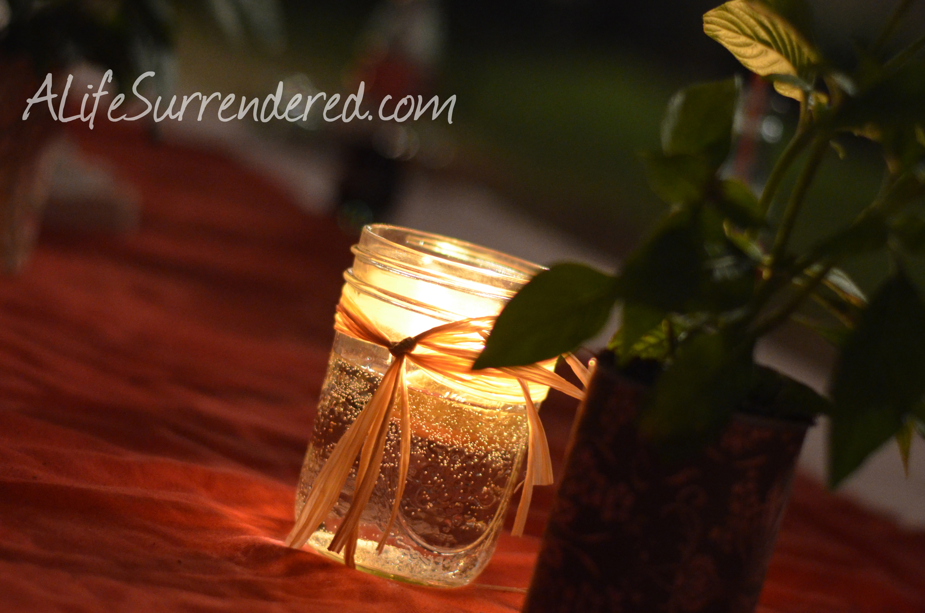 The tablescape adorned with items that we already owned — except for the pretty plants which Husband bought.