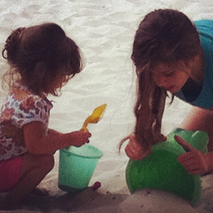 130. Big-Sis kneeling and playing with toddler baby girl in the sand